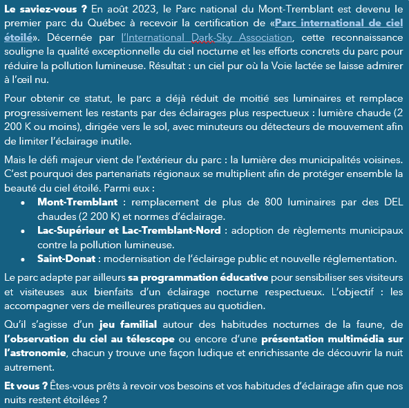 C'est en étant informés et en portant une attention particulière à l'éclairage extérieur que nous pourrons collectivement limiter la pollution lumineuse sur notre territoire et conserver notre vue sur la voûte céleste qui constitue une grande richesse.